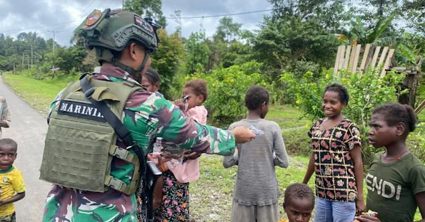 [Prajurit Satgas Yonif 6 Marinir saat menjalankan tugas menjaga keamanan secara humanis]