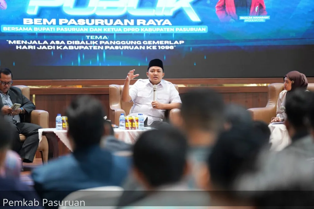 Pasuruan, 26 Oktober 2025 –Pemerintah Kabupaten Pasuruan mengajak sekaligus membuka peluang seluas-luasnya bagi mahasiswa untuk berpartisipasi aktif dalam pembangunan Hal itu disampaikan oleh Bupati Pasuruan, Rusdi Sutejo pada saat didapuk sebagai narasumber dalam Dialog Publik Badan Eksekutif Mahasiswa (BEM) Pasuruan Raya.