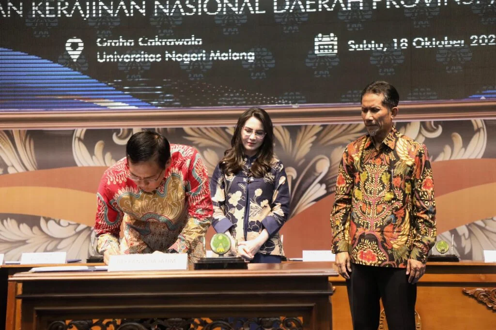 MALANG, 25 OKTOBER 2025 – Ketua Dewan Kerajinan Nasional Daerah (Dekranasda) Provinsi Jawa Timur Arumi Bachsin Emil Dardak dan Rektor Universitas Negeri Malang Hariyono melakukan penandatanganan komitmen bersama Universitas Negeri Malang dengan Dekranasda Jatim.