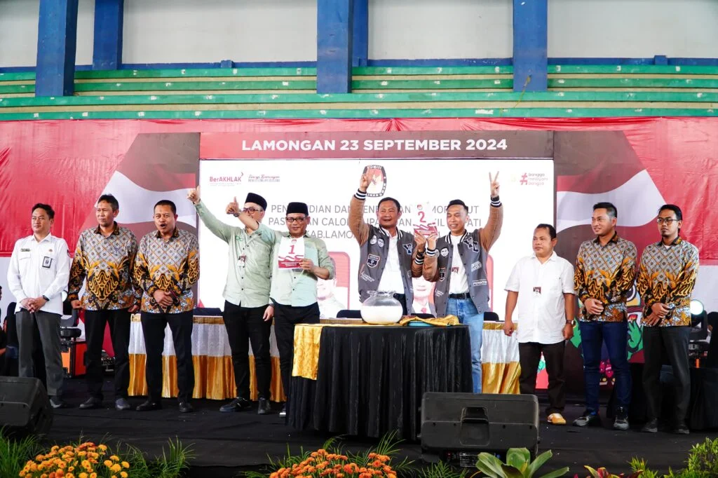 Lamongan, 23 September 2024 – Komisi Umum (KPU) Kabupaten Lamongan gelar rapat pleno terbuka pengundian dan penetapan nomor urut pasangan calon Bupati dan Wakil Bupati Kabupaten Lamongan Tahun 2024, Senin (23/9/2024) di Lamongan Sport Center.